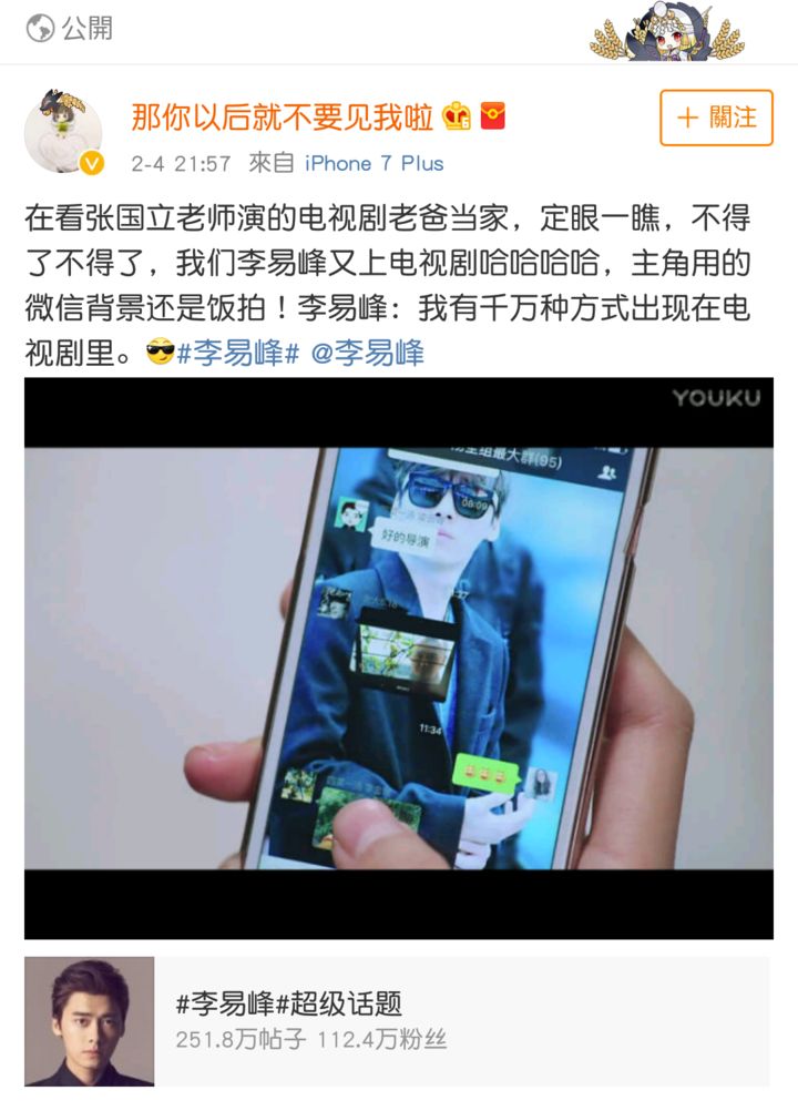 李易峰又上电视剧了,真是闭关中的一大惊喜啊!有蜜蜂在看张国立老师演的电视剧老爸当家中,发现主角用的微信背景是饭拍机场图!