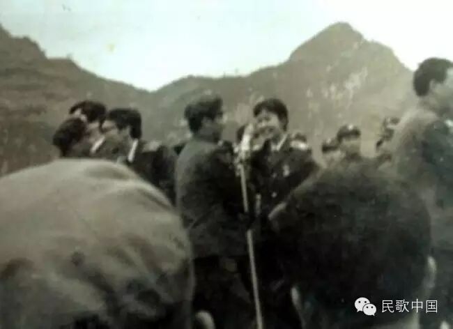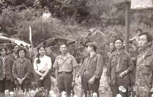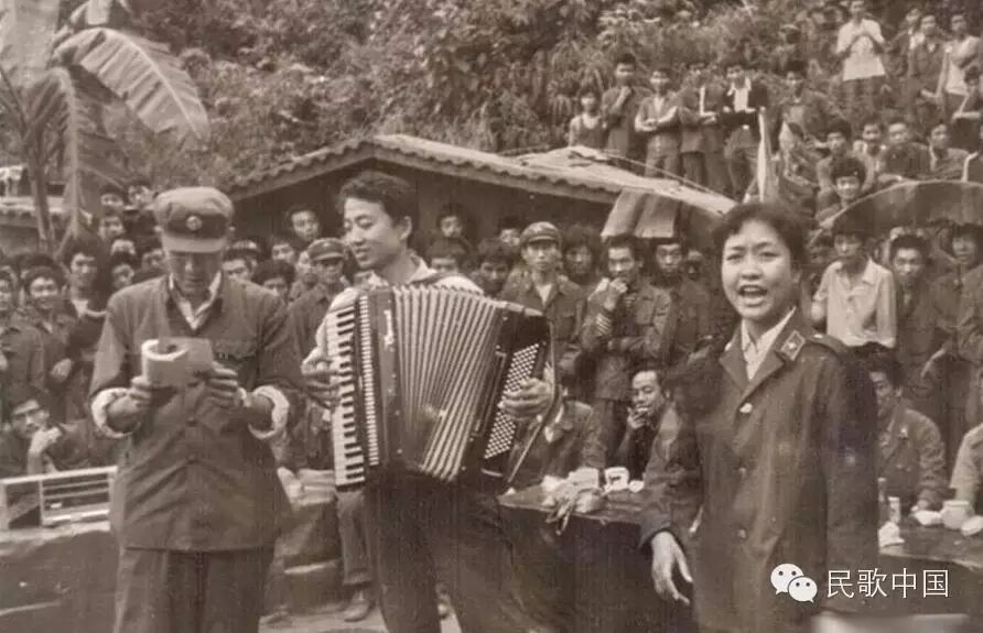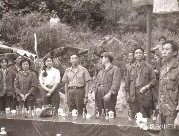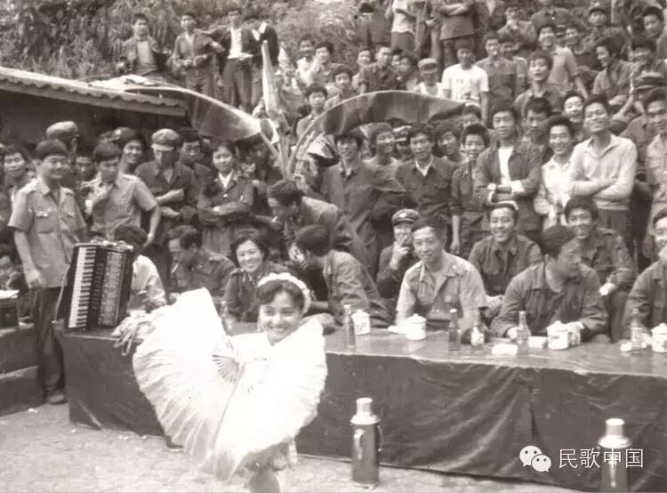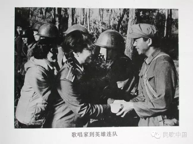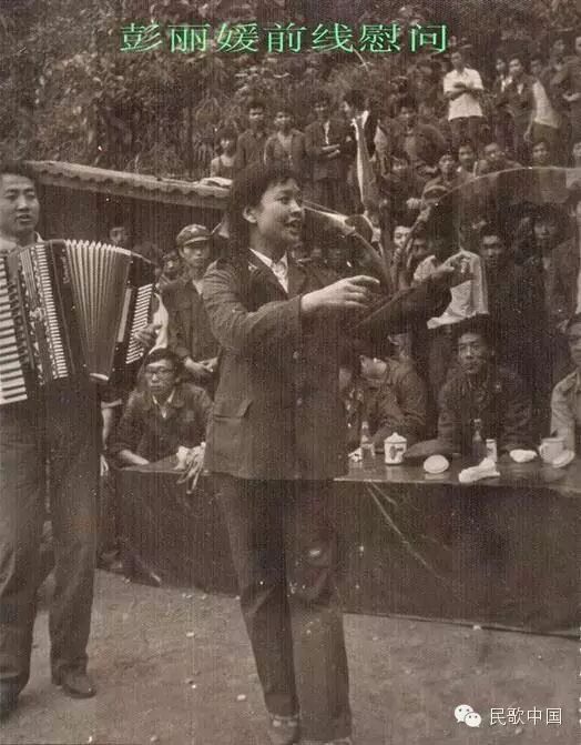 彭丽媛等歌唱家慰问驻守老山前线的解放军士兵。