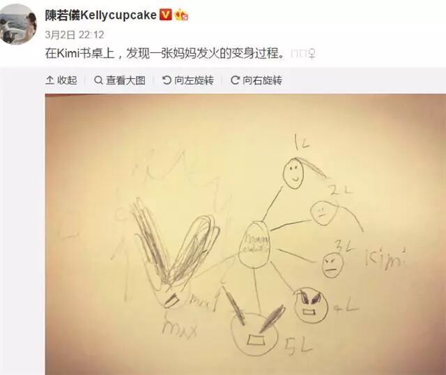3月2日深夜,陈若仪晒出一张kimi的画,是妈咪在Kimi书桌上,发现的一张妈妈发火的变身过程的作品。