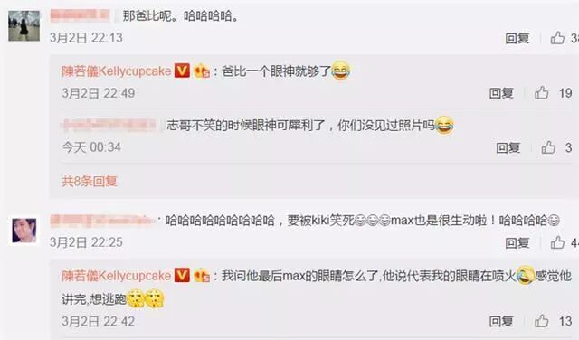 在评论中,陈若仪还和大家互动,因为大家不相信陈若仪会发火,“会喔,不过我会预告他,我快发火了,请你去写作业或做该做的事。”“我问他最后max的眼睛怎么了,他说代表我的眼睛在喷火,感觉他讲完,想逃跑。”真的有这么可怕吗?也只有kimi哥哥能感受到了,以后还会有双胞胎。有粉丝问,妈妈发火了,那爸比呢?陈若仪回复:“爸比一个眼神就够了。”