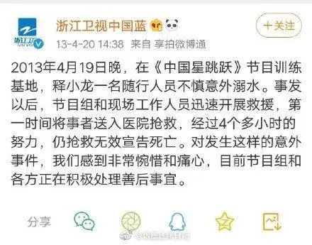 综艺节目出现安全问题,其实这并非孤例。最近几年,综艺事故层出不穷,艺人受伤似乎成了家常便饭。2013年,释小龙的助理在浙江卫视《中国星跳跃》节目训练基地意外溺水身亡,年仅18岁。