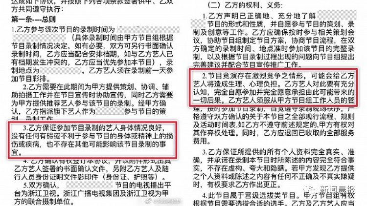 针对网络上曝光的《追我吧》艺人协议,记者咨询了北京中伦文德律师事务所上海分所的李宇明律师,他表示,网传合同中虽然有艺人方“完全自愿参加并完全承担由此可能带来的一切后果”的免责条款,但根据我国《合同法》第53条,造成对方人身伤害的免责条款无效。