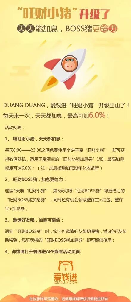 登陆爱钱进APP可以继续喂养旺财小猪哦~还有更多花样,更多加息,等你来!