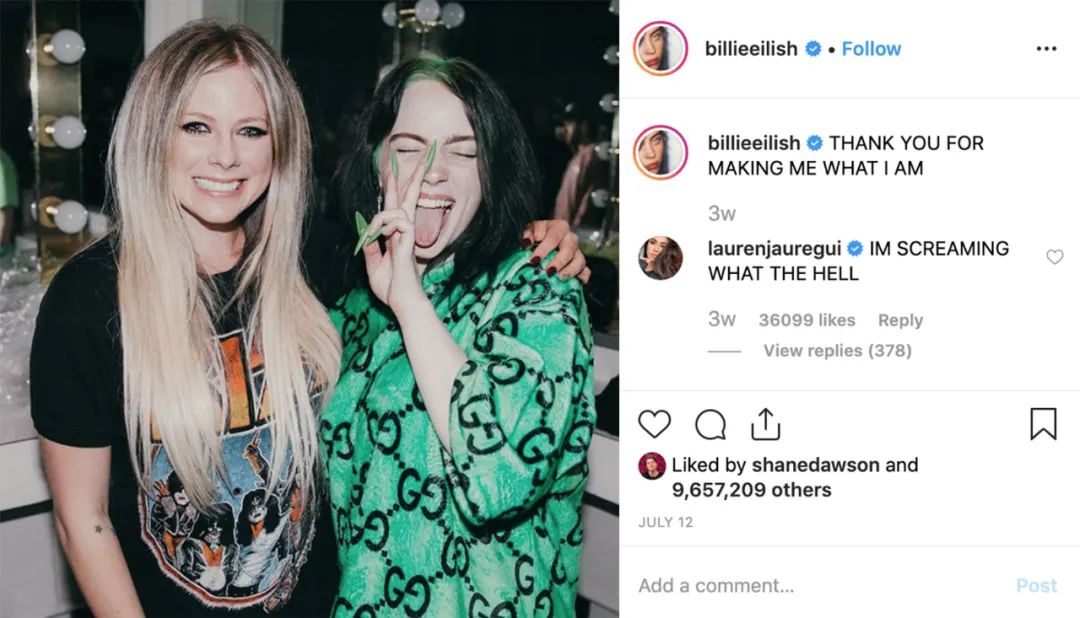 Billie Eilish,够火了吧,她是艾薇儿的迷妹,曾发过一条ins,大意就是说多亏有艾薇儿的影响,她才能变成现在这样。