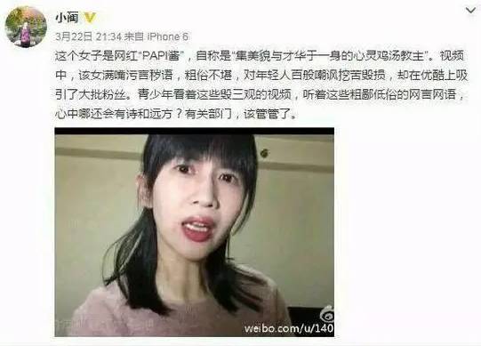 早在三月份就有微博实名认证为“共青团中央网络影视中心 党组成员 副主任”的网友小蔺,连发2条微博痛批网络红人PAPI酱,称其满嘴污言秽语,粗俗不堪,有关部门该管管。