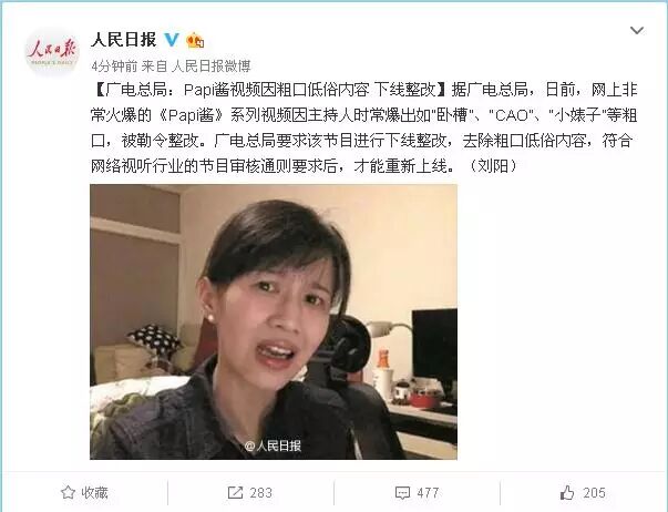 不过就在今天上午,各大媒体的认证微博号,都在转发一条有关《网红papi酱遭广电总局封杀》的帖子。内容称国内各大视频媒体网站平台,已经接到了广电总局通知,要求将《papi酱》系列作品下线,原因为“以直接、暗示、唇语等方式表述粗口、侮辱性语言内容较多”。