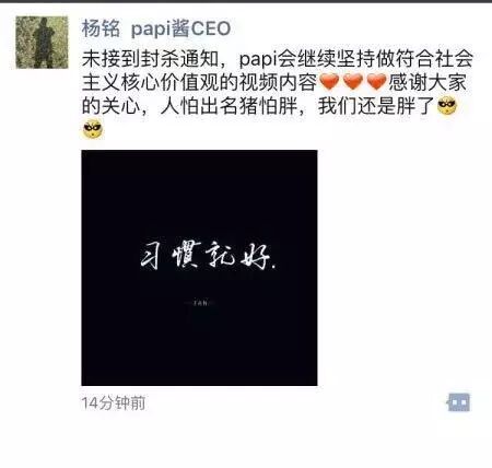 而Papi酱合伙人杨铭也在朋友圈回应:“未接到封杀通知,Papi酱会继续坚持做社会主义核心价值观的视频内容。感谢大家的关心,人怕出名猪怕壮胖,我们还是胖了。”