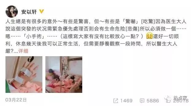 今年3月22日,安以轩在微博上发了一条消息说,自己做了一个小手术↓