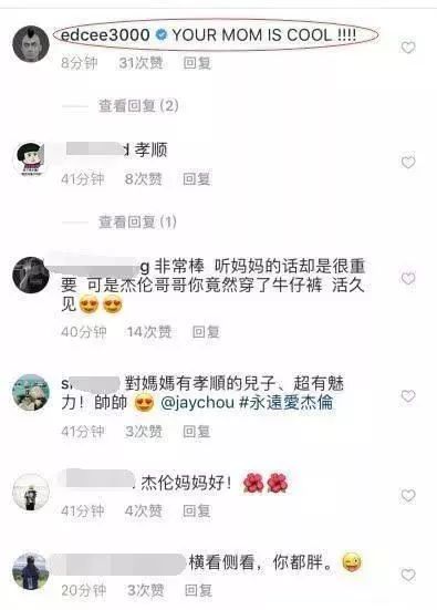 就连周杰伦好友陈冠希都忍不住用英文称赞:“your mom is cool!(你妈妈真酷)”