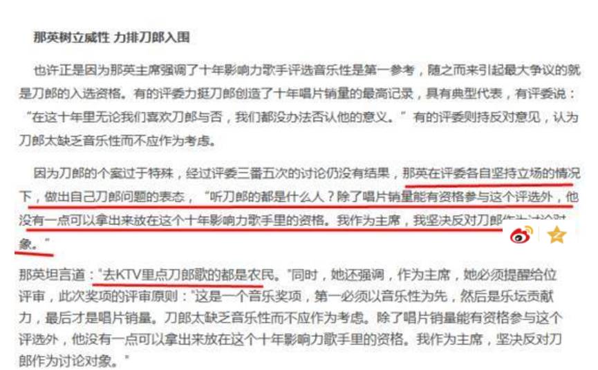 2010年那英担任音乐风云榜十年盛典的评委主席,在评选“乐坛十年影响力歌手”时,那英和其他评委意见不合,那英极力反对刀郎入围“乐坛十年影响力歌手”。反对就反对吧,总要有理由吧。好的,那英倒是一点没顾忌,张大了嘴呼啦呼啦将刀郎以及歌迷们讽刺了一番……