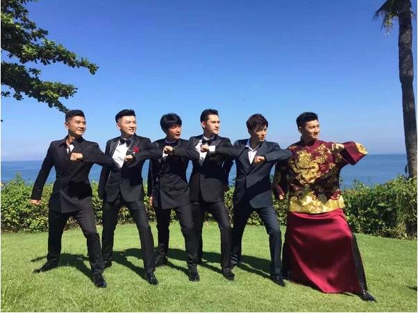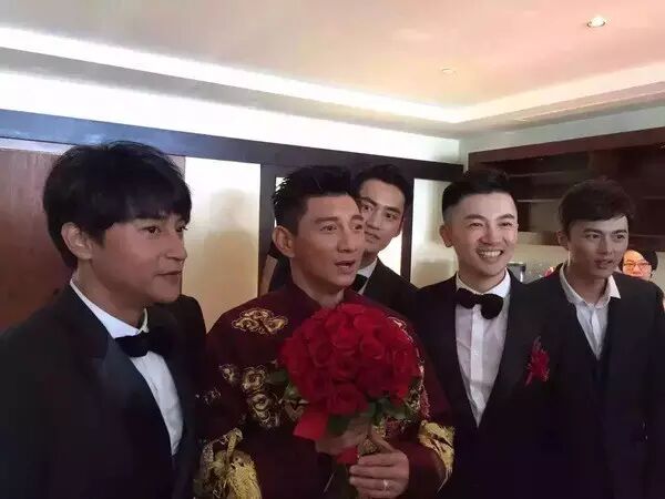 另一个伴郎是《步步惊心》的十三阿哥袁弘(右二),兄弟团还有十阿哥叶祖新(右一)以及奥运体操冠军邢傲伟(左一)。真是史上最帅,没有之一。