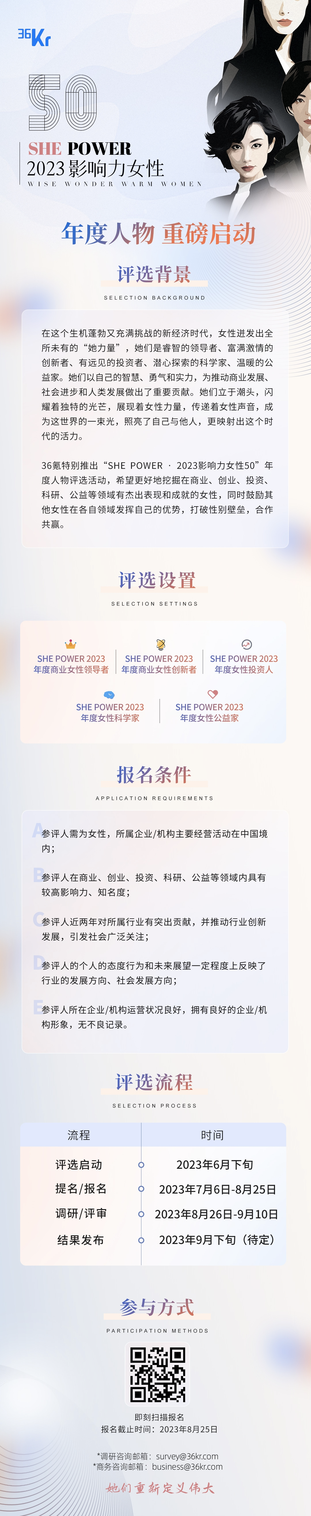 中国新经济的时代浪潮,女性正以独特的共情力与洞察力,撑起一片天地。从商业、创业到投资、科研,甚至在公益领域,处处可见女性光芒。上野千鹤子在《始于极限:女性主义往复书简》中说:我的价值由我创造。是的,在几个世纪女性自我意识的斗争升级中,从被看见、被承认上升到自我价值创造,上升到所处领域的行业价值、社会价值和自我价值影响,这正是36氪想展示的女性影响力。