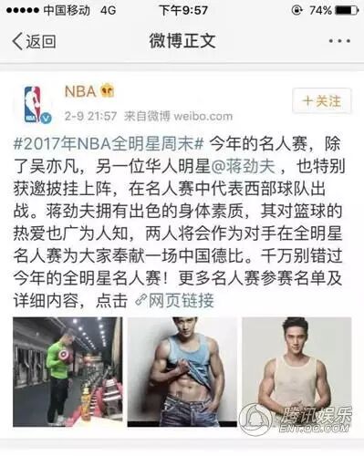 近日,NBA官方资讯平台发布一条状态,内容道“今年的名人赛,另一位华人明星蒋劲夫也特别获邀披挂上阵,在名人赛中代表西部球队出站。蒋劲夫拥有出色的身体素质,其对篮球的热爱也广为人知。”引起网友热烈讨论。