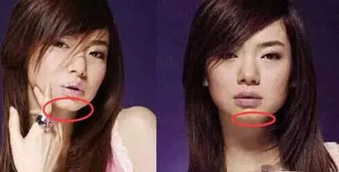 左图旧照下颚比较圆润,右图的近照尖下巴都戳出来了,苹果肌高得不能忍受。