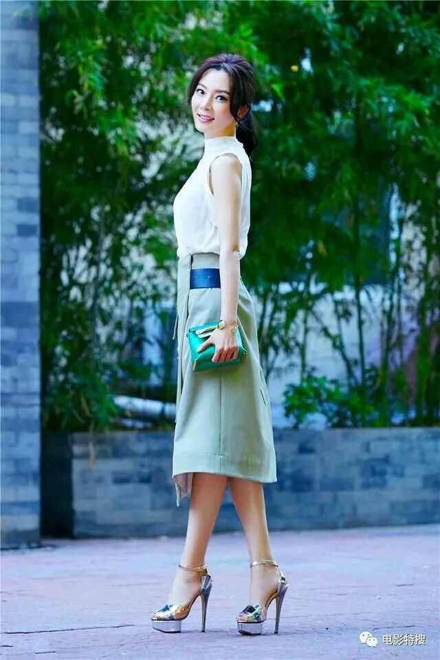 陈数绝对算是大美人,穿着姜黄色紧身连衣裙的她,彰显凹凸有致的好身材。可惜脚上穿的黑色驴蹄鞋真的欣赏不来这种审美。
