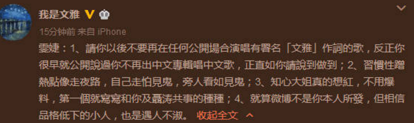 气得文雅直接喊话,你才是习惯性地蹭热点,以后别唱我写的歌。