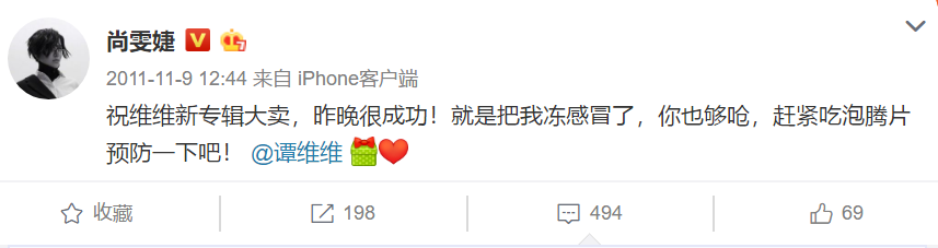 尚雯婕也还留着祝谭维维专辑大卖的微博。