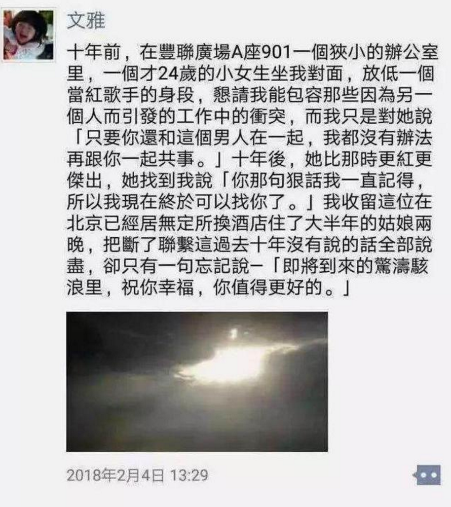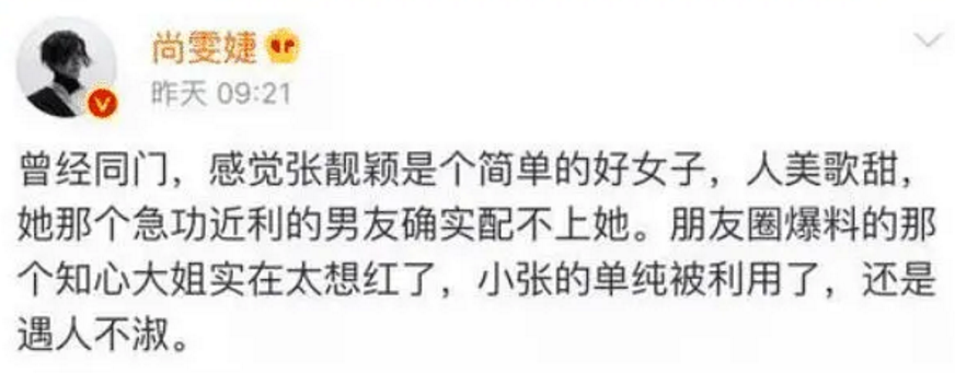 天娱高层、词作者文雅在朋友圈,为张靓颖庆幸,摆脱了垃圾婚姻。
