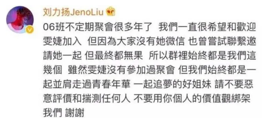 刘力扬的回答是:大家没有她微信,联系不上,但始终是好姐妹。