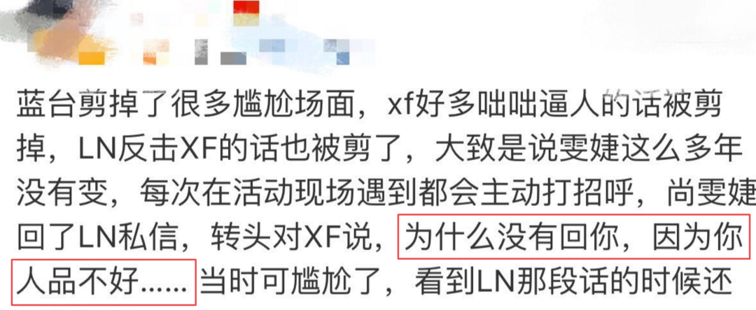 据观众repo,当时现场厉娜表示尚雯婕回过自己的私信,没有回复许飞,直言:“可能是你人品不好!”