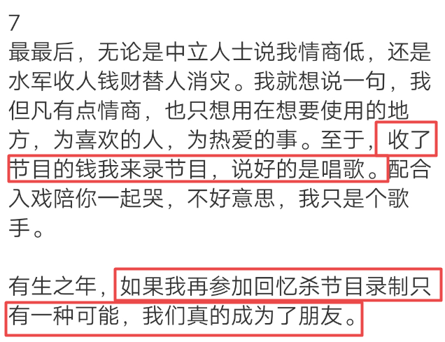 能来录节目完全是因为节目组给了劳务费。她以后不会再参加这种“回忆杀”的综艺了,除非是为了“真朋友”。