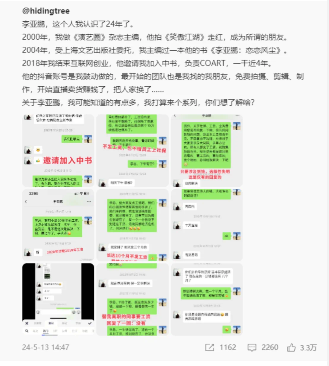 起因是李亚鹏的一位前员工向他追讨工资,这位前员工发布了一些李亚鹏迟迟不还钱的聊天记录。在这些聊天记录里,李亚鹏的文字彰显了一种不卑不亢,不怕开水烫的气质。任人追债一百遍,他仍对你如初恋的感觉。