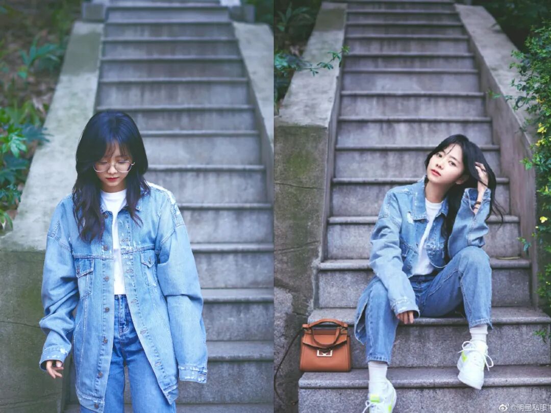 谭松韵只有脸是肉肉的,身材其实很不错,oversize的牛仔外套搭配同色系牛仔裤,既能凸显元气的酷,也能凸显两小姐的长腿。
