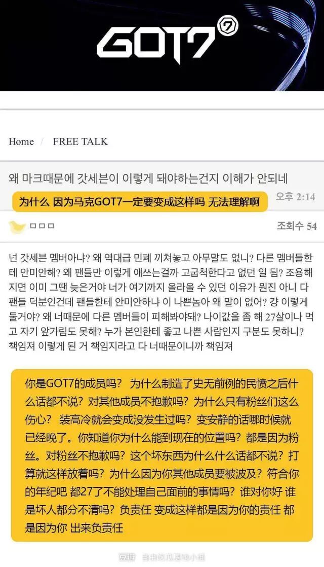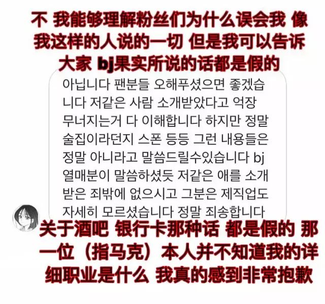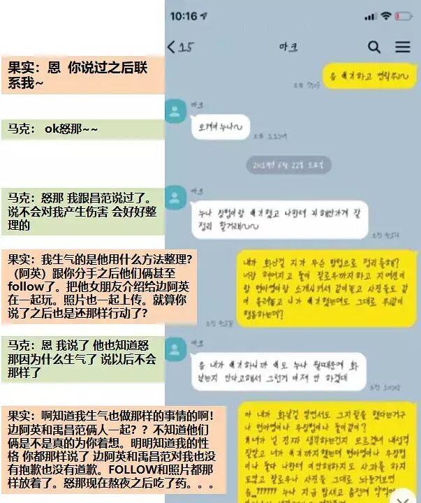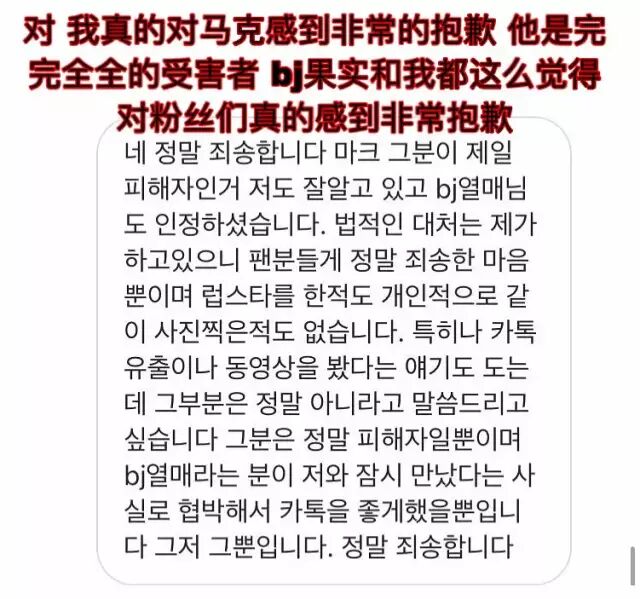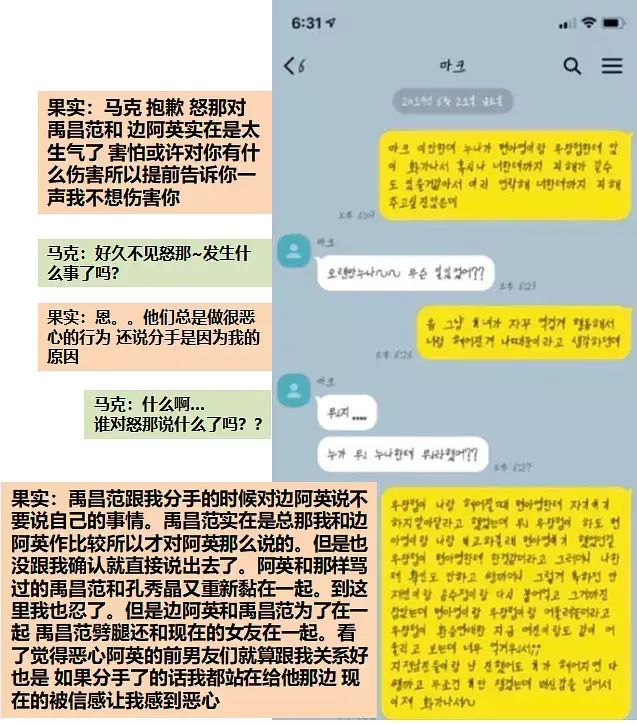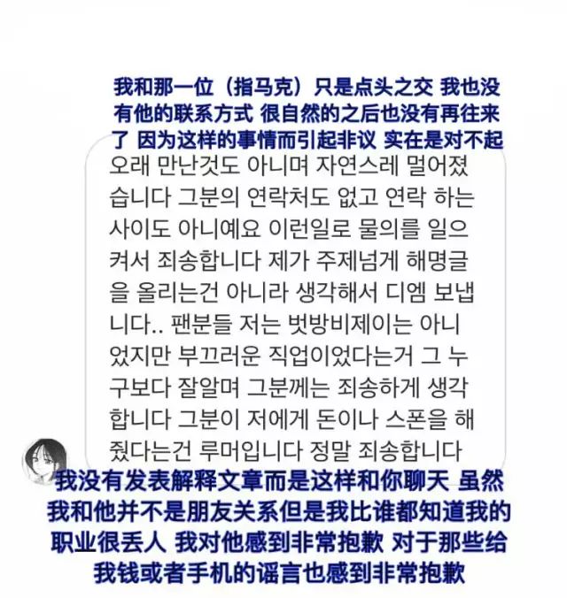 但是两个BJ的互殴其实我们也没那么关心,关键是小姐姐还在论坛上公开了与禹昌范的聊天内容,其中讲到了MARK之前和BJ阿英谈恋爱。