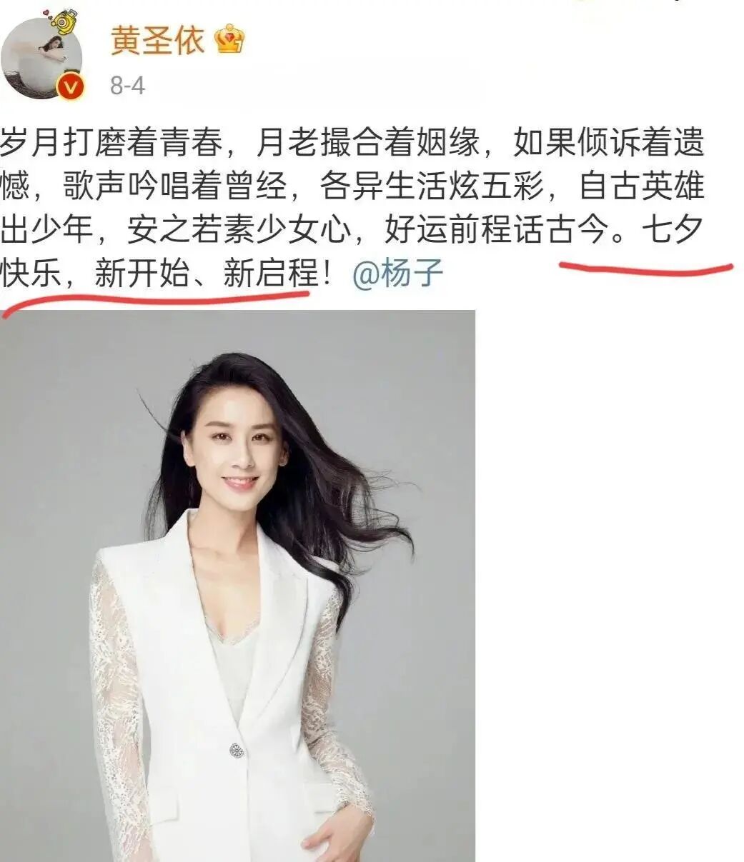 而这次之所以会被怀疑两人离婚,是因为黄圣依在七夕当天在社交平台上发布了文案:“各自安好 ”,而杨子则写道:“相见不如怀念” 。