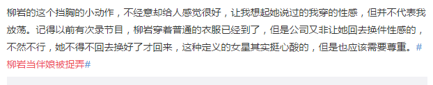 后来在《煎饼侠》中,她说:“这么多年,别人还是说柳岩什么都不会,只会借胸上位。”而大鹏则为其洗白道:“胸是你自己的,怎么是借呢?”