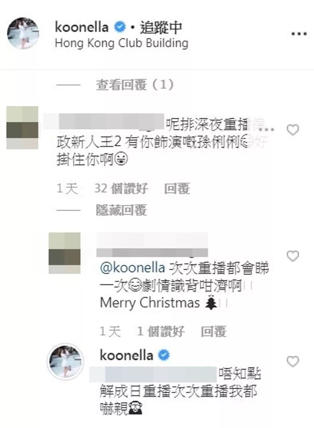 网友提起现在每晚看重播,原来Ella都有留意(IG:@koonella)