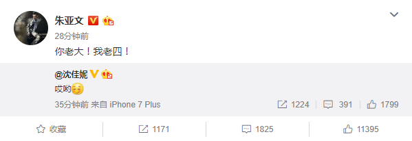 昨晚,沈佳妮就在微博“尖叫”称:“哎哟!”随即,朱亚文第一时间转发回应示爱称:“你老大!我老四!”大方承认老婆怀孕。
