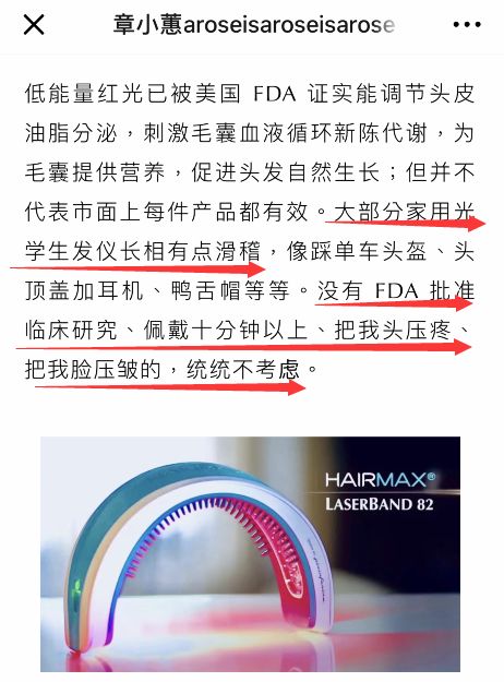 在章小蕙的文章里,提到了大量Hairmax的使用测评,是亲身体验+热情推荐的那种。