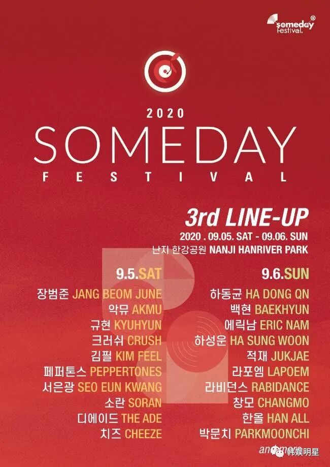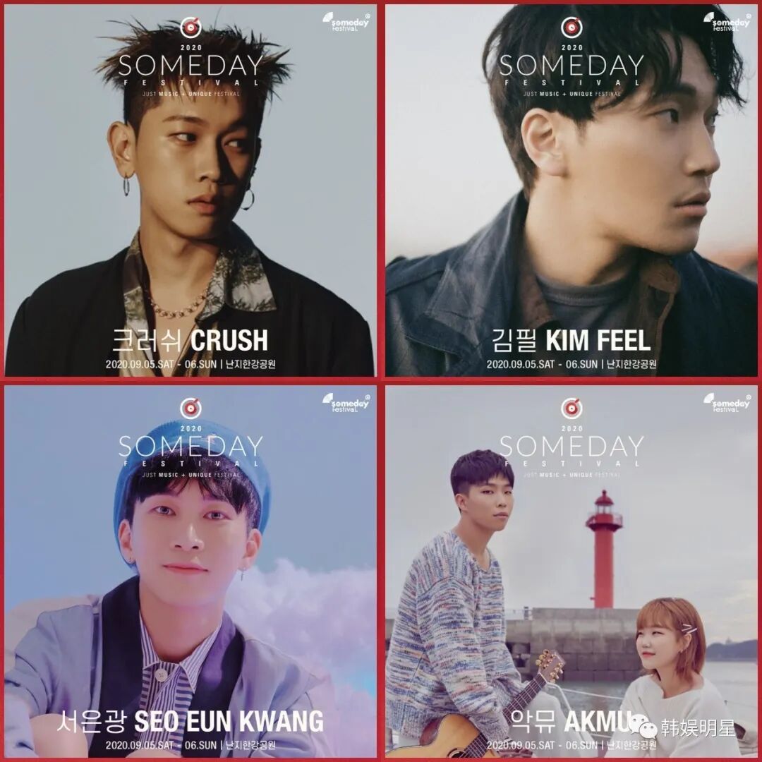 《Someday Festival》本周公开了第三波阵容,包括张凡俊、AKMU、圭贤、Crush、Kim Feel、BTOB 徐恩光、EXO 伯贤、Eric Nam、河成云、昌模⋯⋯等人都确定会登台演出。
