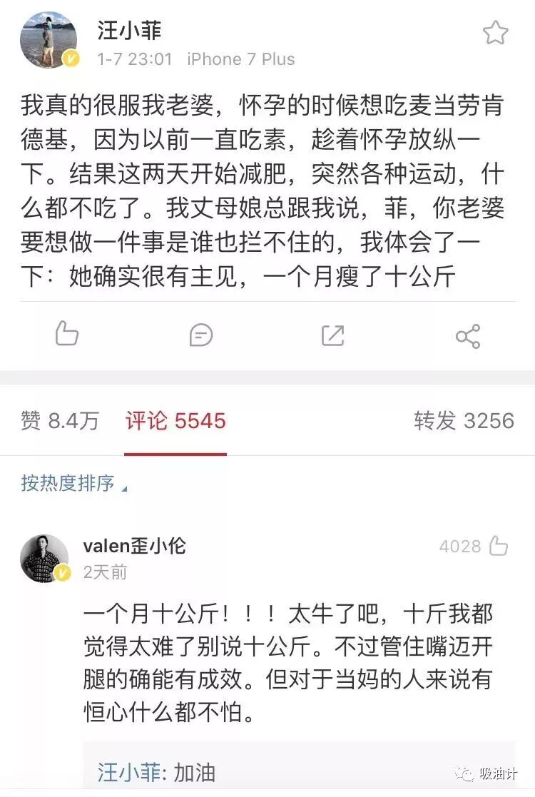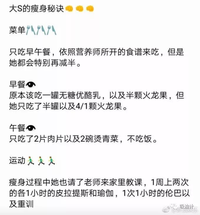 ▲说到瘦身食谱,就不得不提大S了,她曾在微博上晒出自己的瘦身餐以及减脂秘诀。边吃边减掉足足10公斤肉的大S,惊人的毅力让老公汪小菲十分佩服。