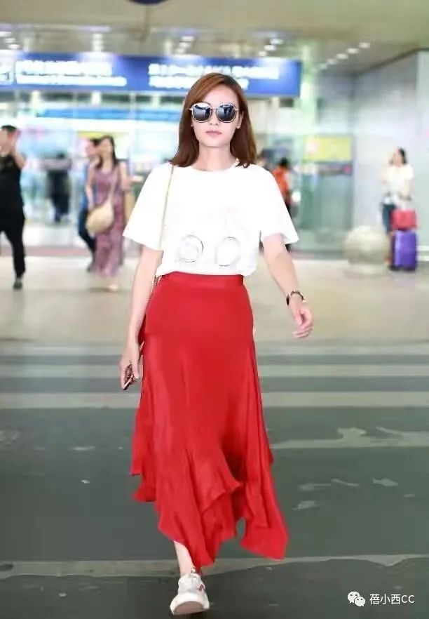 因为T恤本身比较休闲慵懒,想要穿出优雅又知性的女人味,不妨试试T恤+半身裙的组合。众所周知,裙子单品是最能展现女性魅力的单品,两者的碰撞总是能让造型自带一股慵懒休闲又浪漫温柔的气场。比如叶一茜这身机场造型,就是穿了一件白色T恤搭配红色长裙,满满大女人风范。