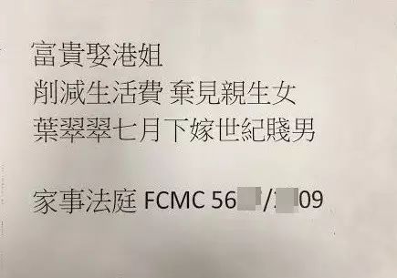 结婚原本是喜事,不过,昨日有人向传媒爆料,指“富贵娶港姐,削减生活费,弃见亲生女,叶翠翠七月下嫁世纪贱男”并随信附上一个家事法庭的案件编号,似有家庭纠纷闹上法庭。