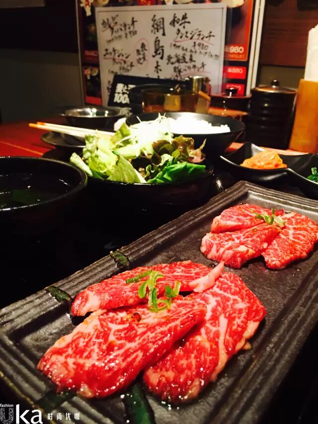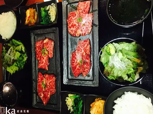 先说美食,到日本第一餐零晨宵夜不算,第二天吃午已开始吃硬货^_^相当于150人民币一套的和牛套餐,每份6片牛肉,加上佐料,米饭,摆满一大盘子,我们3人叫了4份,没准备吃到撑,只是浅尝,我也不爱吃肉,中午也吃不下,但是……火点上了,肉烤上了,佐料拌上了,米饭包上了,放进嘴里了,顿时肉溶了,饭滑了,口甜了,胃爽了,于是4份也不够了~