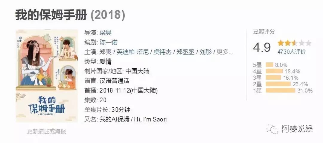 郑爽的新剧《我的保姆手册》正在播出中,虽然网播量还过得去,但是豆瓣评分还是挺惨烈的。