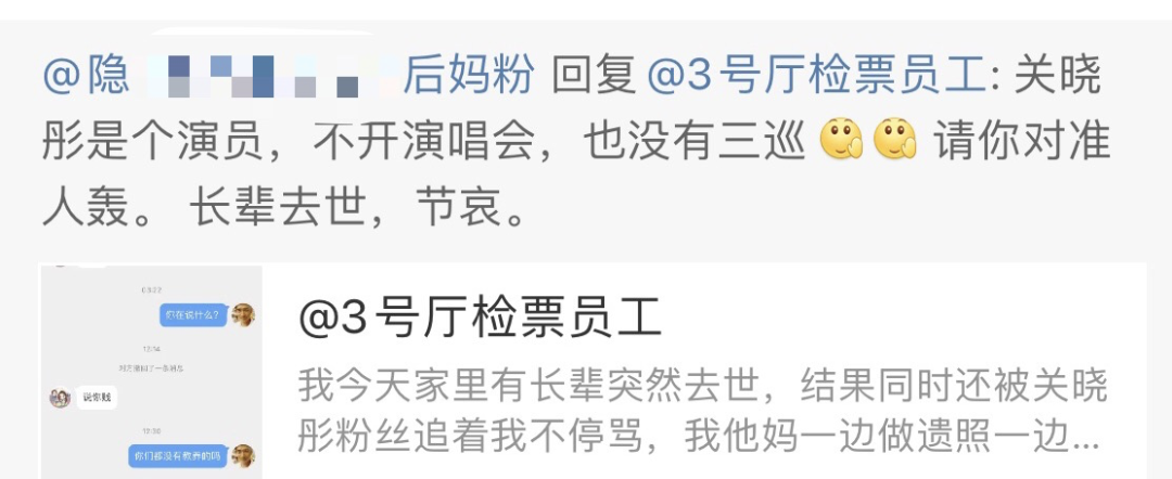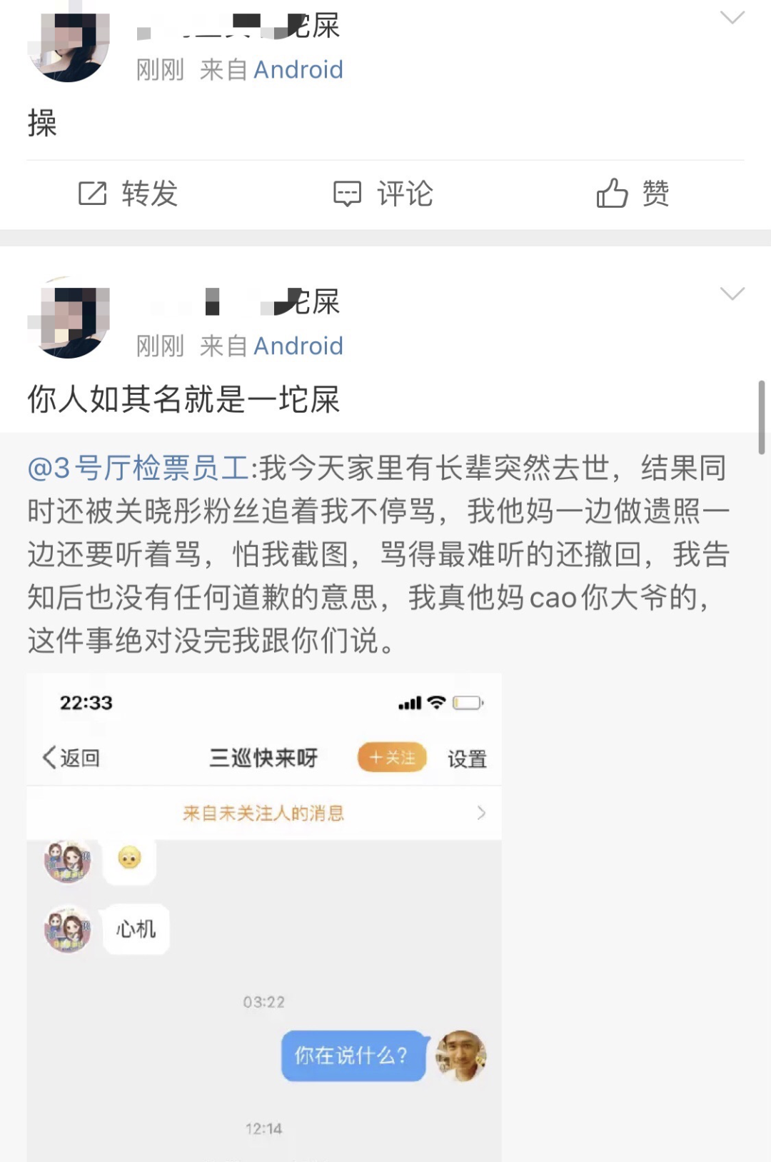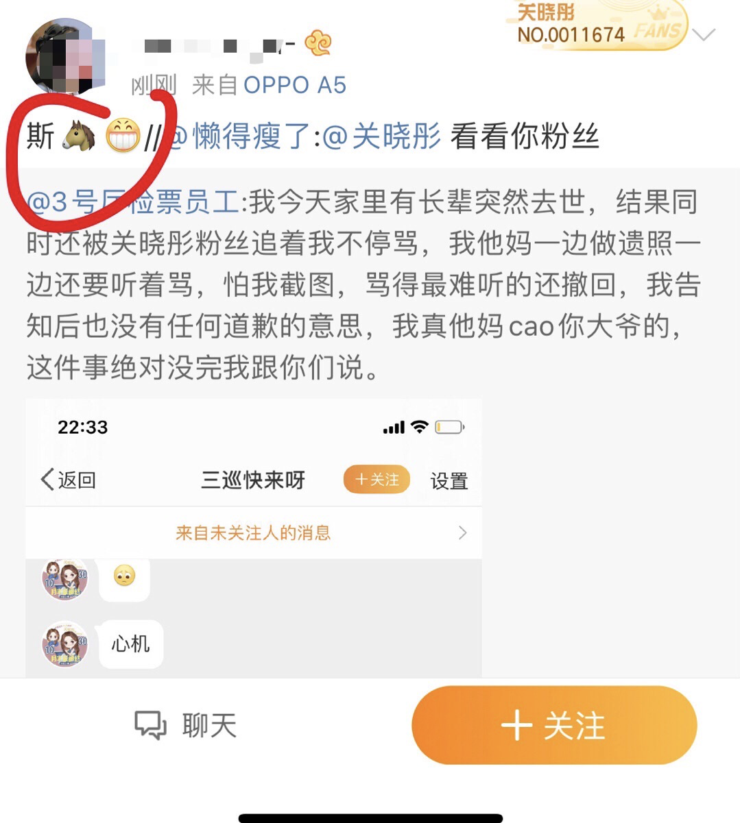 敬告关晓彤粉丝 3号厅检票员工 内地女星 2020-11-03 22:33:59 1082 创作不易,用心坚持,欢迎请BaGua喝几杯爱心咖啡!打赏并支持本文 打赏并删除本文 写在前面 我做电影媒体四年,和数不清的饭圈粉丝打过交道,我知道这里面有善也有恶,我们也经历过不少的语言暴力,自诩还算习惯了这些。 但这一次,我真的有些忍无可忍,到了要专门发推文回击的程度。 一「经过」 一切始于我们10月30日的一篇文和一条微博。 内容是对关晓彤和黄景瑜主演的电影《月半爱丽丝》的批评,这部电影目前在豆瓣的评分是3.8分,是今年评分倒数第二的院线电影,第一是《喜宝》,是那种毋庸置疑级别的大烂片。 这两条内容,全文都没有任何一句提及关晓彤和黄景瑜的表演问题,因为我们倾向于剧本和导演的问题更大,两位表演虽然也不好,但不算主要责任。 但我真的没想到,即使没有提到,两位主演的部分粉丝依旧无法容许这些批评的声音存在。 方法也很简单粗暴,控评和污蔑。当然,这些我都还挺常规的,我也习惯了,当时回骂几句也就罢了,还不至于专门写文伺候。让我生气的是后面的事情。 微博发出后的第二天,也就是11月1日,我家中突然有长辈去世,我从杭州赶回家奔丧。 同一天,我的私信开始陆陆续续收到关晓彤粉丝对我的辱骂。当时我在照相馆做遗照,手机里依旧登登登在跳出辱骂的私信,那个场景真的让我切身感觉到了一种饭圈失控状态的恐怖,和他们对普通人的一种侵犯。而且他们很聪明,辱骂完都会把骂的最难听的话撤回,估计是怕截图。 哪怕我明确告知了家中有人去世,希望能“放尊重点”,“道个歉这件事就算了”,但她们也依旧没有任何认错的意思,至今都没有理会我。 相反,哪怕是在我把这件事发出微博之后,我都没有得到道歉,只是换来了更多的辱骂。 有觉得我亲人死的不够,继续骂我死妈的, 有辱骂一键三连的(这位在事情闹大后来找我道歉了,但我并不打算接受) 有我也不知道是真路人还是装路人的,颠倒黑白,说我编造故事的。有秉承受害者有罪论的。有倒打一耙的。有让我多反省一下自己的。有我也听不懂她在说什么的。你们骂我我都能习惯,但骂我家人干什么呢?还是在我明确说了亲人去世的时候。但这些还不是我生气的重点,后续更可笑。当我连续发微博开始反击的时候,其他关晓彤粉丝估计是终于意识到我是做什么的,事情有多严重了。离奇的是,她们意识到事态严重的第一反应,不是来向我表示歉意,而是忙着推卸责任,忙着开除粉籍。因为那个粉丝还同时喜欢鹿晗,所以把所有的责任都推到鹿晗粉丝的身上,让我去对准鹿晗“轰”。仅有的几个私信道歉还都是为了告诉我,我挂出来的那个粉丝其实还喜欢鹿晗,是CP粉,让我别怪关晓彤。还有不少涌来我微博底下,拼命说服我,这是鹿晗粉丝干的,别放过鹿晗。我当时都看傻了。你们是自己在饭圈过家家过太久了,不知道外面都已经四个现代化建设全面小康了是吧?2020年了各位。你因为关晓彤骂我,我骂回去,还得先考虑你除了这个偶像是不是还有别的偶像,到底要骂哪个?我需要管你这个关晓彤粉丝,除了喜欢关晓彤还喜欢谁吗?你们是自己傻逼,还是当我傻逼?骂我的也不止她一个,你们这么骗自己有什么用呢?我还特意在她们挂黑的那位的微博搜索关晓彤的名字,录了个屏给大家感受一下,这大概就是三分之一,根本拉不到底。那位粉丝也是真的可怜,一个小女生这几年替关晓彤发了上千条应援微博,光《月半爱丽丝》就买了7张电影票支持,现在出事了立刻就打入死牢,和关晓彤无关,是批皮黑粉,是鹿晗那边派过来的卧底CP粉。还来拼命煽动我去骂鹿晗。怎么着?你们关晓彤的饭圈现在是热衷演绎什么叫「伴君如伴虎」了吗。今日共饮,明日杀头,有用的时候当牲口用,没用的时候当牲口宰。这就是你们家饭圈本质啊?领略了哈。但我真得给你们说,搁电影里面,你们就是那种最下贱的反派,编剧这么写都会被我们骂“坏的太脸谱”的那种反派。要点脸,真的。二「粉丝行为,偶像买单」整个事情的经过也差不多讲完了,接下去是今晚的第二个部分,也就是大家最期待的「粉丝行为,偶像买单」部分。其实也不是我硬要上升你们正主的,是最开始好多关晓彤粉丝强烈要求的——ta们一直说:你就是故意黑关晓彤。我说:我冤枉啊,我写文都没提关晓彤一句。ta们:你就是在黑关晓彤。我:行吧,那我黑一下吧。而且挺不巧的,我别的什么都不会,就是懂点电影啊,表演啊什么的,我就只能展开聊聊关小姐在这部《月半爱丽丝》中,演得到底有多烂吧。最根本上,是选角的问题。 她饰演的晓曦,是一个因为肥胖,自小就被欺负,长大后也经历了大量社会歧视,生性自卑的女孩子。 但是今天还在以#我是在逃格格#上热搜的关晓彤,很显然是没有这种角色体悟的。 我们前天的推文里就聊到过,演员要先找到自己合适的定位,做好基本,再去尝试挑战,演员首先要自知。这也是为什么她在《二十不惑》里演一个高傲的女神不会出戏,但是在这里演一个自卑的胖子却各种露怯。 关晓彤这样的演员因为选择权的泛滥,导致她对自我的定位不清,没做到自知,便急于挑战,说白了,没有自知之明。 电影里这种的体现比比皆是,最明显的就是她对自卑和害羞的表演理解是混淆的。 她面对每一次遇到歧视的处理都是低头,轻咬嘴唇,但这其实并不是自卑还是害羞。