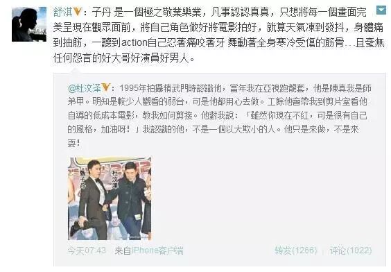 2012年3月,赵文卓与甄子丹因拍戏纠纷隔空撕逼,当媒体和网友一边倒的炮轰甄子丹戏霸时,舒淇却力挺甄子丹,称赞他“敬业认真”,随后遭到网友的炮轰她是非不分,黑白颠倒,同时更有好事者扒出她早年的一些大尺度裸照,不堪受辱的舒淇清空微博上所有内容,以示抗争。