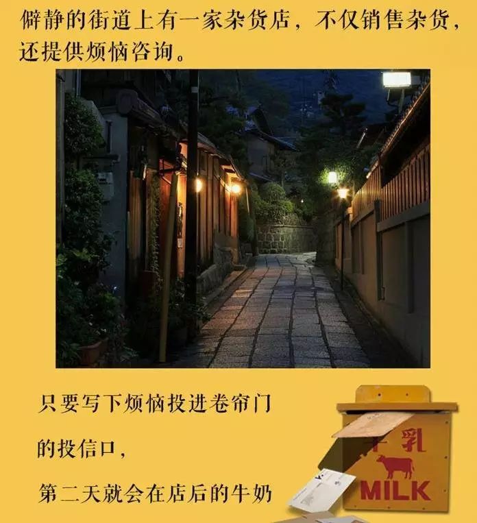 这家看似再平常不过的杂货店有一个特别之处:只要写下烦恼投进店前门卷帘门的投信口,第二天就会在店后的牛奶箱里得到回答。