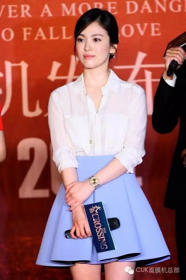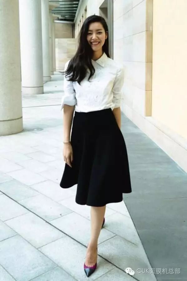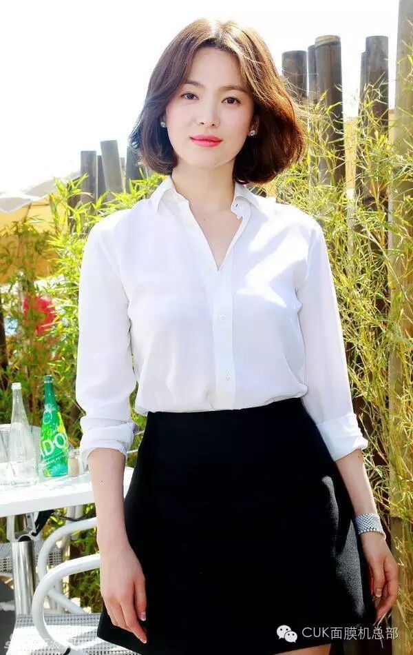 说起白衬衫最会穿的就是宋慧乔了,白色的衬衫搭配黑色/天蓝色的伞裙,注意挽起的袖口和上面解开的两颗扣子,干净清纯又优雅大方!