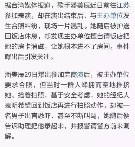 4月29日晚,歌手潘美辰在沭阳参加某商业演出。5月1日,网络上开始疯传这样一条新闻: