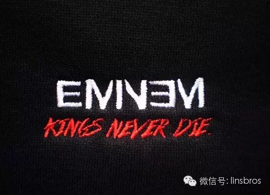 正面用刺绣绣花Eminem新字体和KINGS NEVER DIE. 街头体字样,低调但霸气侧漏,