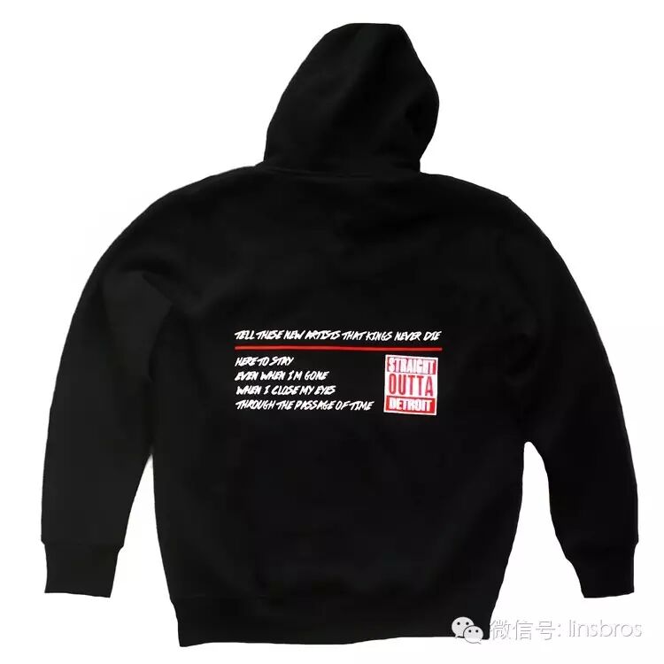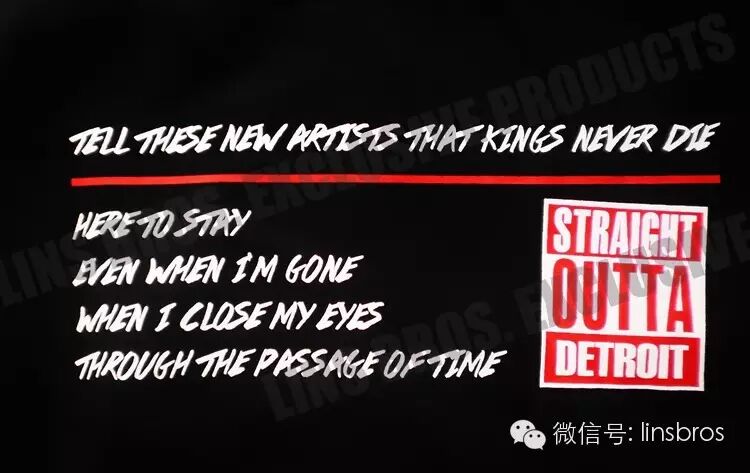 背面采用印花,非常牢固不掉色,内容是KINGS NEVER DIE. 里的精选歌词,映衬王的主题和Straight Outta Detroit的Eminem底特律(反E)标。