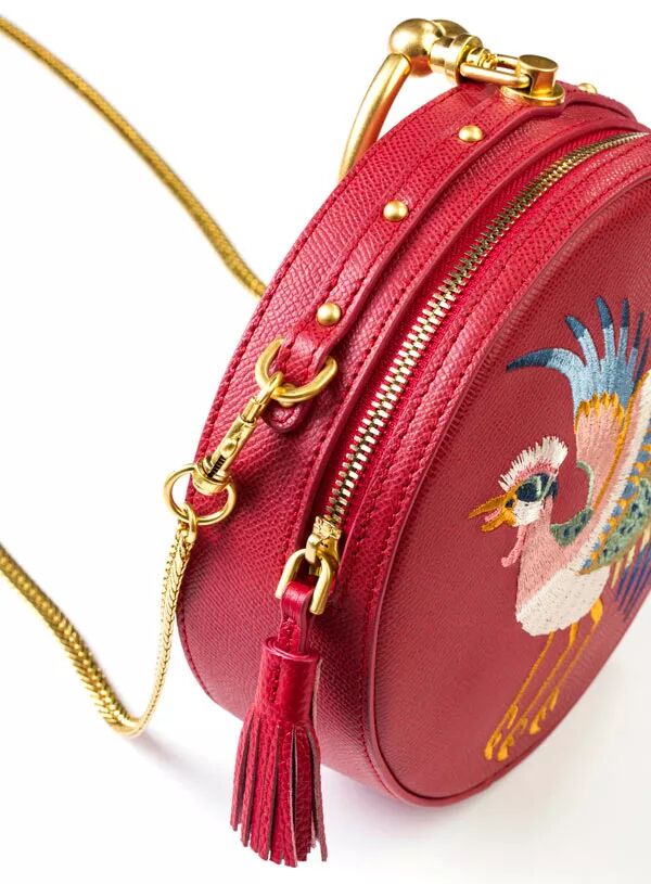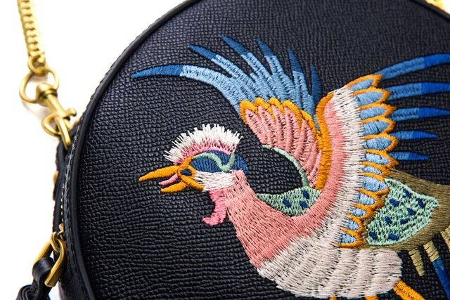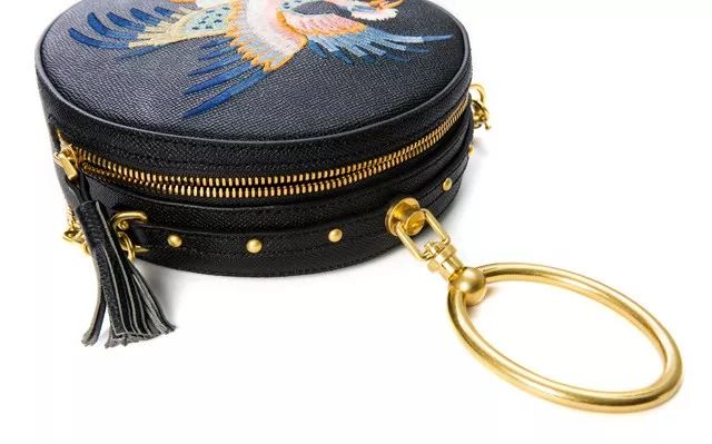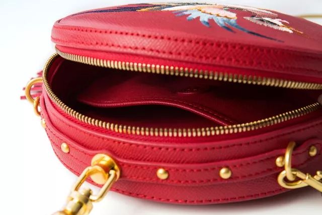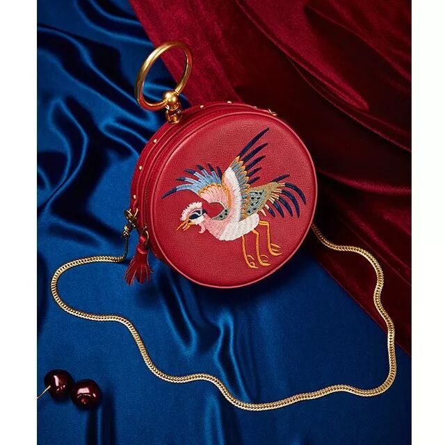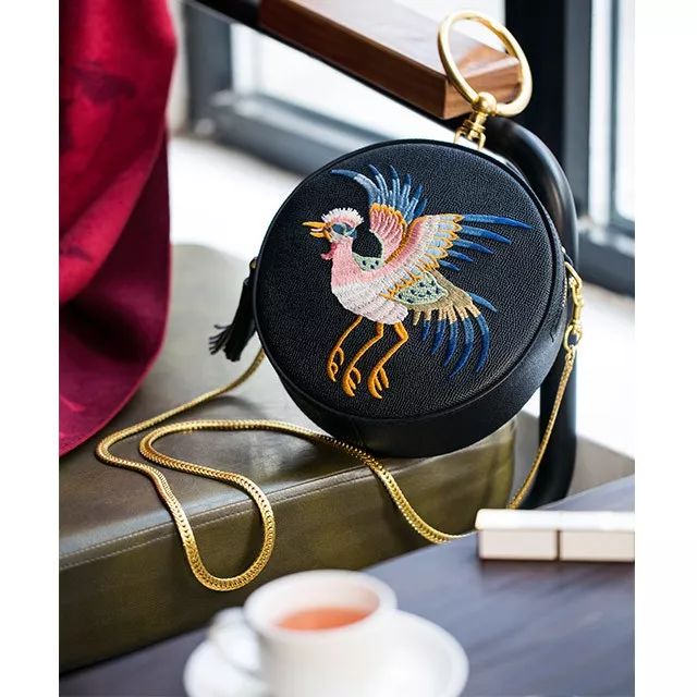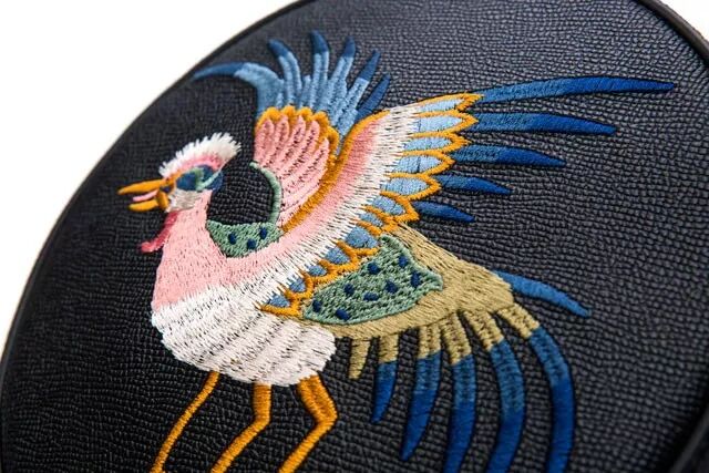包包上的刺绣图案,是以中国古代龙袍上的日章纹样图案——名叫“三足金乌”、守护太阳的神兽为灵感设计而成。
