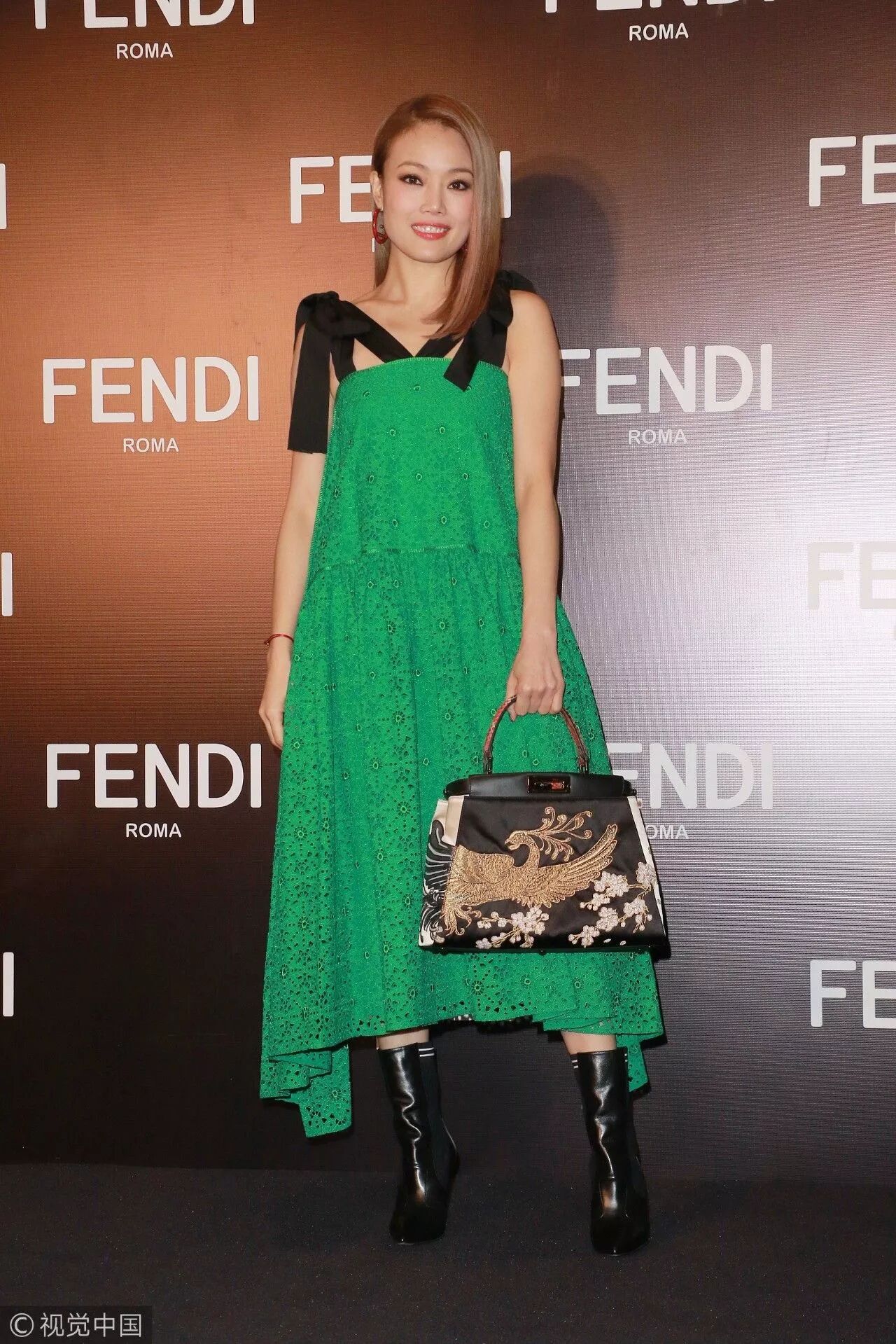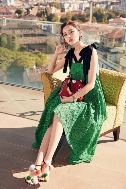 ▲古力娜扎身穿Fendi绿色雕花蝴蝶结肩带连衣裙,给我们带来宁静的异域美,手中的Fendi Peekaboo红色手袋和鞋上的彩色毛球装饰又增加了一分童趣。