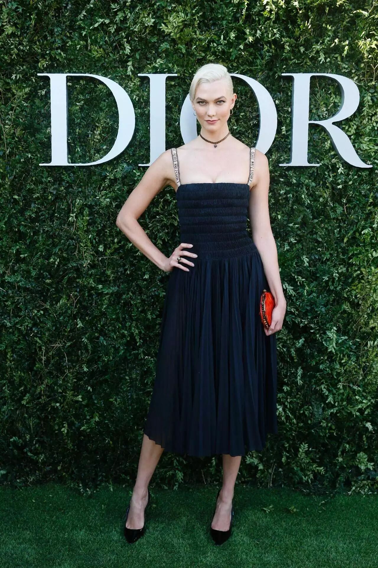 ▲卡莉·克劳斯(Karlie Kloss )也选择了同样的连衣裙,脚穿黑色尖头漆皮高跟鞋,搭配橘色手拿包。拥有超模的好身架,即便没有腰带的帮忙也能轻松穿出高挑姿态,堪称完美!