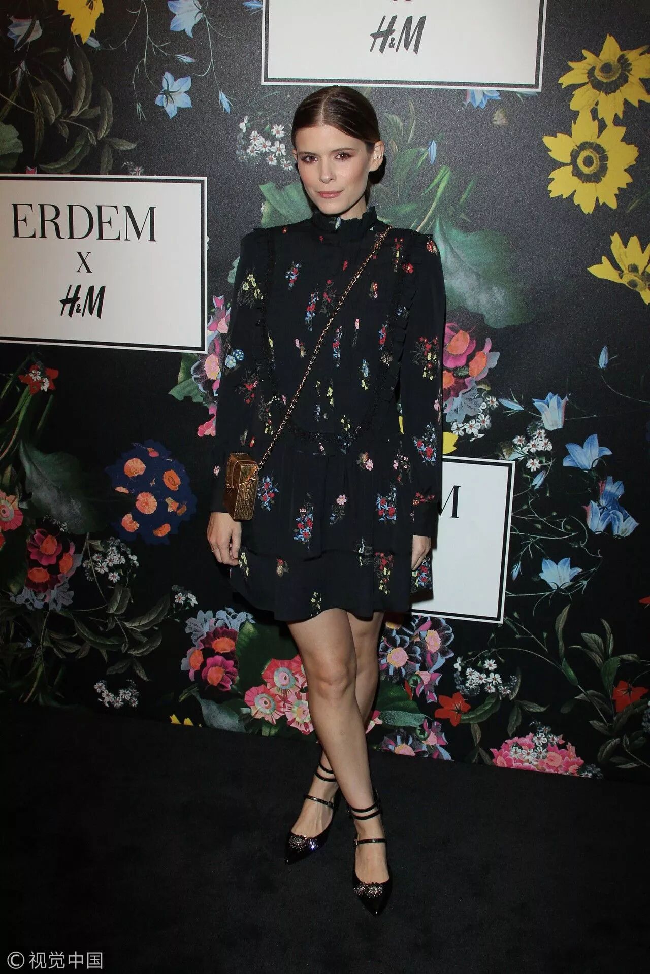▲凯特·玛拉(Kate Mara)身穿同款连衣裙,脚踩黑色亮面高跟鞋,配饰选择了金色小包,整个造型复古优雅。